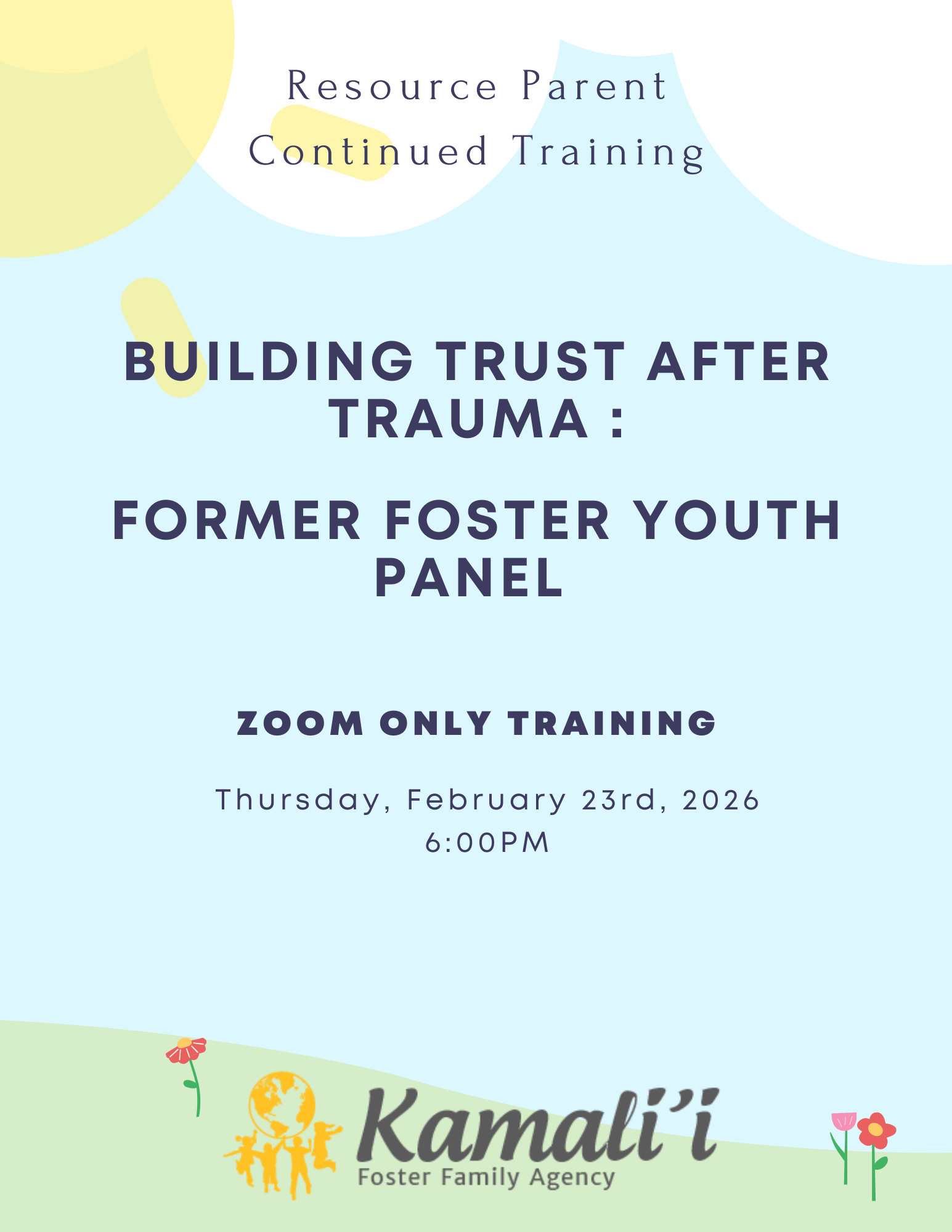 Resource Family Continued Monthly Training Building Trust After Trauma: Former Foster Youth Panel Zoom Class – February 23rd, 2026 @ 6pm Register Now