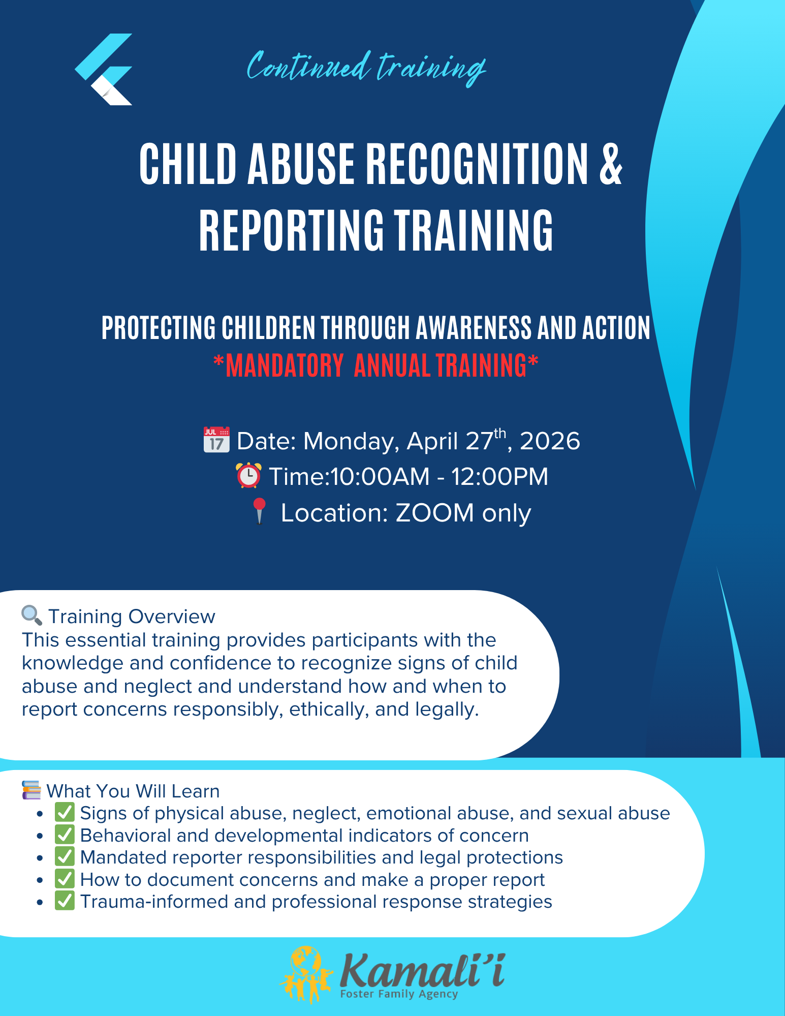 Resource Family Continued Monthly Training Child Abuse Recognition & Reporting Training Zoom Class – Monday,Monday, April 27, 2026 10:00am – 12:00pm Register Now